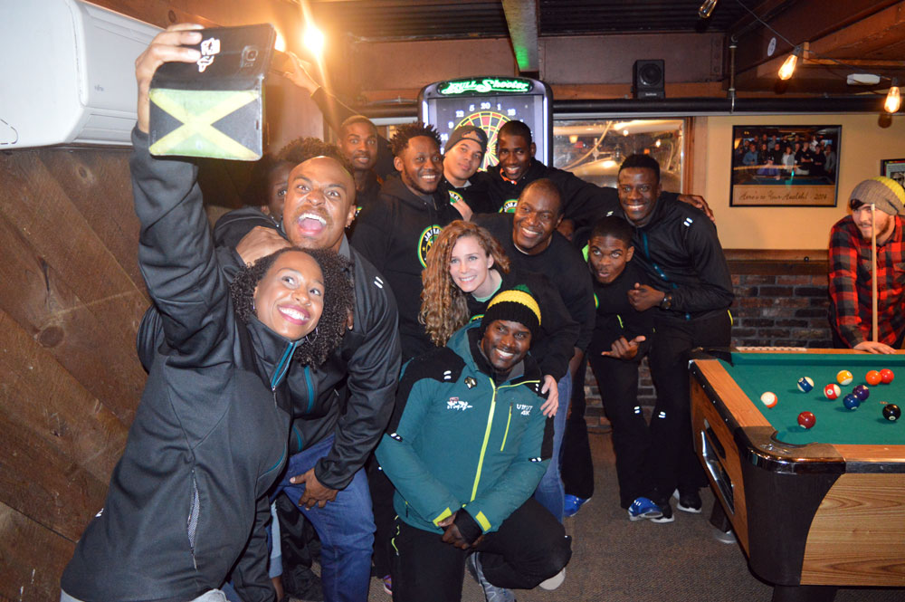 Jazmine Fenlator-Victorian, a former U.S. Olympian in bobsled, takes a selfie with the Jamaican bobsled team during a fundraiser Monday at the Lake Placid Pub & Brewery. Fewer than 400 days from the 2018 Olympics, the team is trying to collect $60,000 in donations to hire a coach. (Enterprise photo — Antonio Olivero)