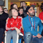 Indian snowshoe racer Tanveer Hussain, center, sits with Saranac Lake Middle School students Friday to watch a video presentation on winter recreation in the mountains of Kashmir, where he comes from. (Enterprise photo — Chris Knight)