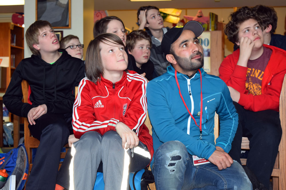 - Indian snowshoe racer Tanveer Hussain, center, sits with Saranac Lake Middle School students Friday to watch a video presentation on winter recreation in the mountains of Kashmir, where he comes from. (Enterprise photo — Chris Knight)