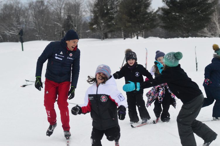 TUPPER LAKE — As a duck call carried over the rolling hills of the Tupper Lake Golf Club’s cross-country ski trails on Tuesday, four-time Olympic biathlon competitor Tim Burke and 20 kids slapped their ski poles into the snow and hopped.