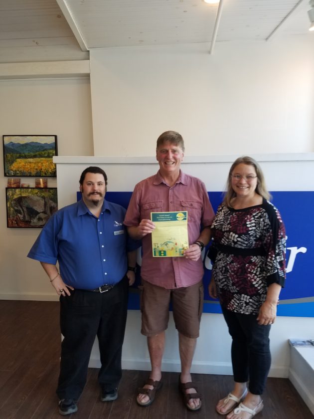 Bill Rich of Saranac Lake is presented with his voucher for two round trip Cape Air tickets from Saranac Lake to Boston by Aleacia Landon, director of the Saranac Lake Youth Center. Bill won the tickets in a drawing during the Olga Memorial Footrace in August. Also pictured is Cape Air ticket agent Jesse. (Photo provided)