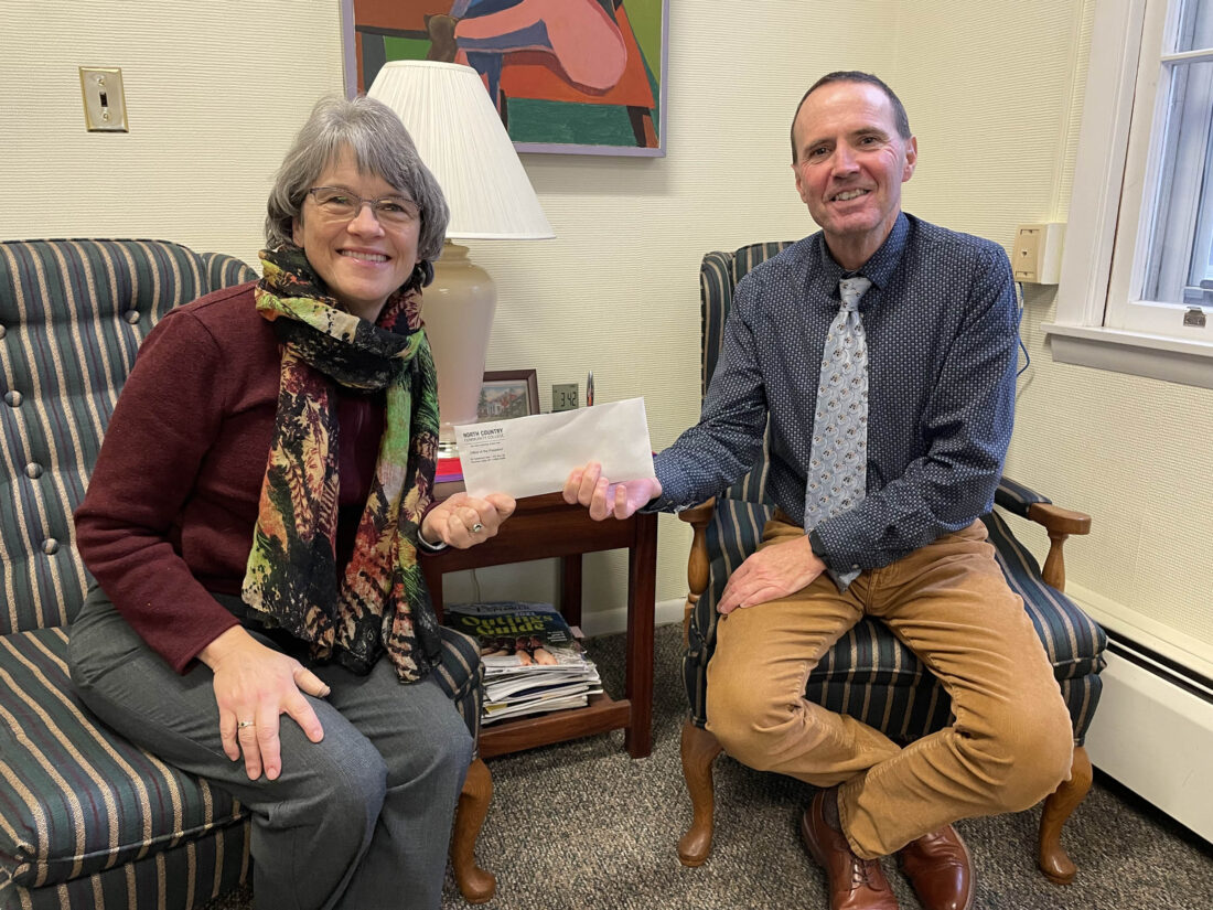 North Country Community College raised $600 for Homeward Bound Adirondacks through a pair of raffles leading up to Veterans Day. NCCC President Joe Keegan, right, recently handed off the funds to Homeward Bound board member Amy Tuthill, the college’s associate director of recruitment and VA officer. The raffles, which included tickets to Army football and hockey games, were spearheaded by Kim Duffey, chair of the college’s business program. Homeward Bound Adirondacks offers year-round healing retreats in the Adirondacks for veterans with post-traumatic stress disorder to include equine assisted therapy, hiking, canoeing, bonfires and team building exercises. It’s currently building a retreat center near Lake Titus, south of Malone. The organization also provides transportation to medical and mental health appointments, crisis outreach, referral and linkage services, all at no cost to the veteran. (Provided photo)