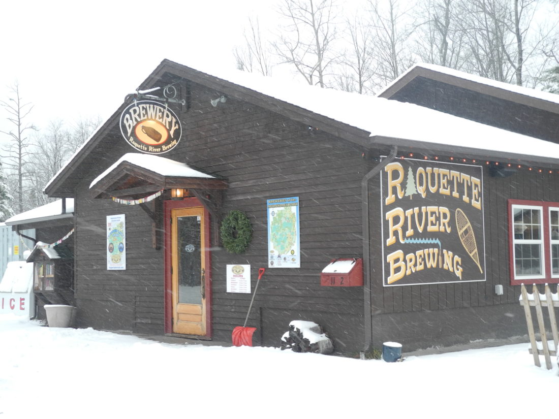 Raquette River Brewing on Balsam Street, covered in snow Monday, will raise funds for the Flanders Performance Park bandshell by hosting eight hours of live music Saturday. (Enterprise photo — Kelly Carroll)