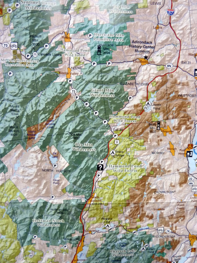The Hammond Pond Wild Forest is made up of many parcels in several Adirondack towns. This map shows the bulk of the Wild Forest, which is around exits 29 and 30 on I-87, as well as parcels in Keene and Keene Valley. (Enterprise photo — Peter Crowley)