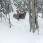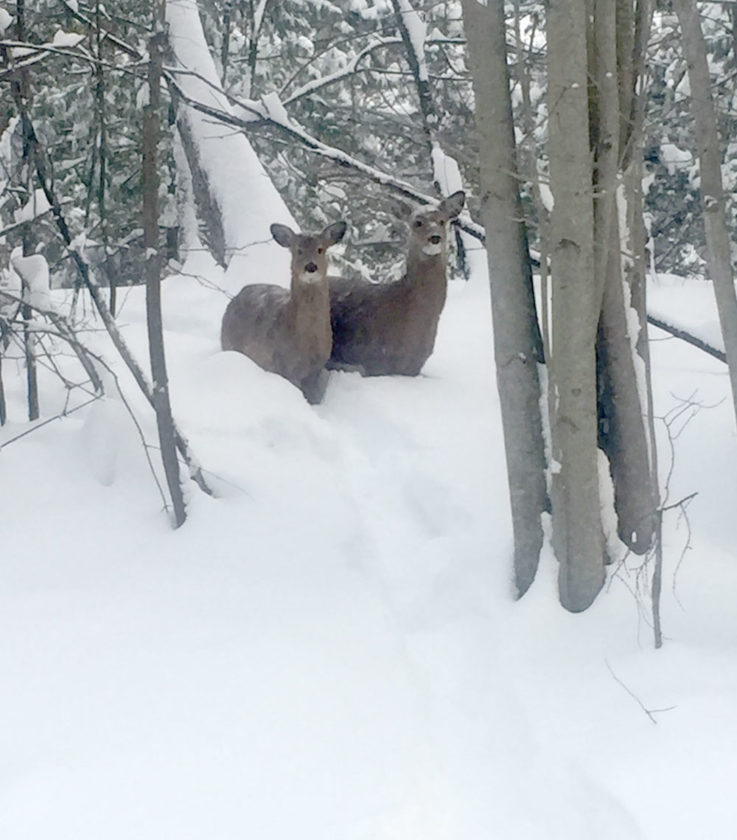 - Two deer make their way through the deep snow in Tupper Lake this morning as the village got more than 2 feet of snow Tuesday. (Enterprise photo — Brittany Proulx)