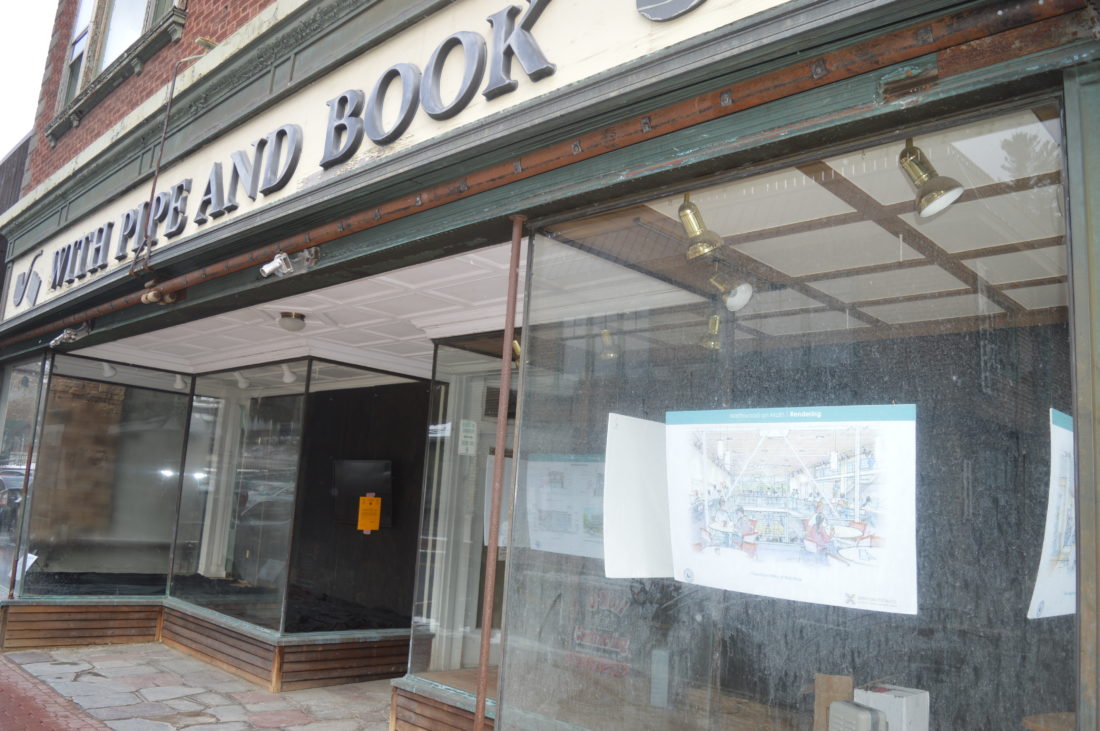 The former With Pipe and Book store at 2495 Main St. is seen Friday with renderings hung behind storefront windows of Northwood School’s plans to convert the space into an educational hub after planned demolition. (Enterprise photo — Antonio Olivero)