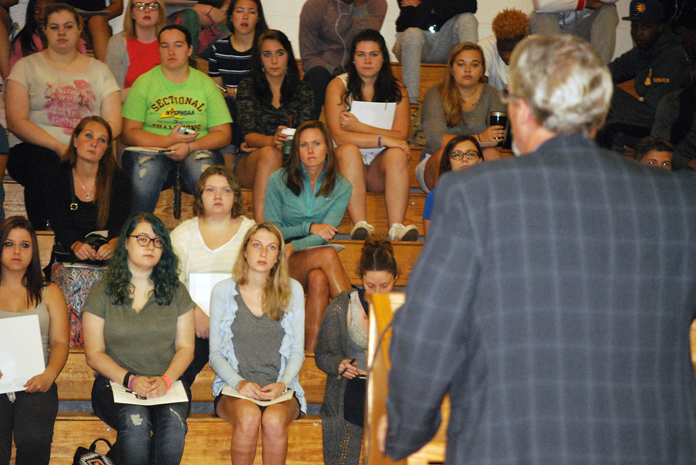 North Country Community College students listen to college President Steve Tyrell at an orientation event on Aug. 30, 2016. NCCC is included in a New York plan to cover the complete cost of tuition at state colleges for full-time students from households making less than $125,000 a year, provided they work in New York for four years after graduation. (Enterprise photo — Chris Knight)