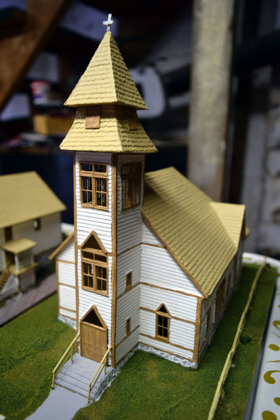 In his spare time, he’s bringing the past back to life by building scale models of the village’s gone, but not forgotten, historic buildings: the old town hall, the original St. Bernard’s Church and the Riverside Inn, among others.
