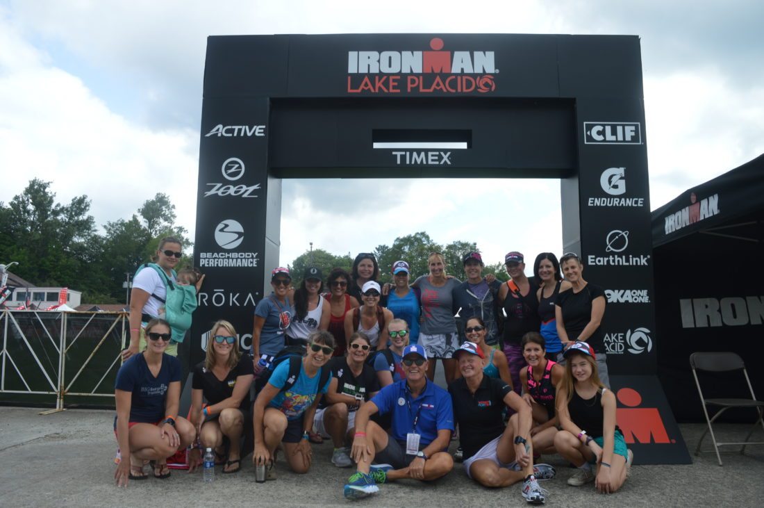 - Member of the “Women For Tri” international group, which has more than 30,000 Facebook members worldwide, pose for a picture at their Ironman Lake Placid meet-up Friday morning at the Olympic Speedskating Oval with “The Voice of Ironman,” Mike Reilly (center, bottom row). (Enterprise photo — Antonio Olivero)