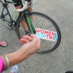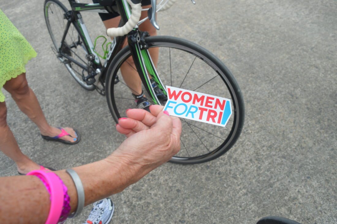 Moira Horan of Spring Lake Heights, New Jersey holds up a sticker from the “Women For Tri” international group, which has more than 30,000 Facebook members worldwide. (Enterprise photo — Antonio Olivero)