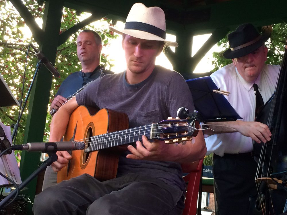 Alex Marklund plays guitar with Crackin’ Foxy in August 2016 at Saranac Lake’s Berkeley Green. He used to be primarily a bluegrass player but learned to play in the Gypsy jazz style for this local band. (Enterprise photo — Chris Knight)