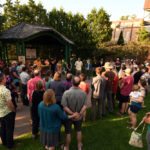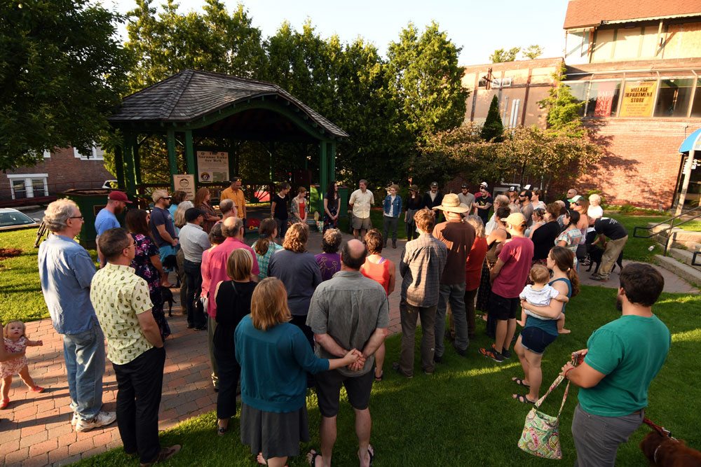 Friends of Alex Marklund gather Tuesday evening in Berkeley Green, in downtown Saranac Lake, as High Peaks Church Pastor Bruce McCulley leads a prayer vigil service for Marklund, who was critically injured in a car crash early Sunday morning. (Enterprise photo — Lou Reuter)