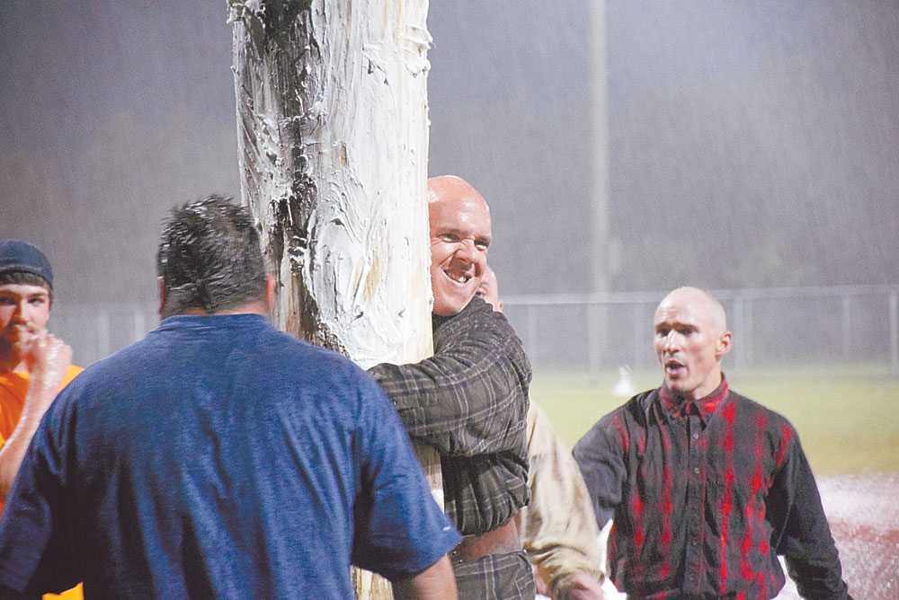 - Rick Skiff of Tupper Lake hugs a greased pole tightly before his team goes on to win the pole climbing competition for the 10th straight year. (Enterprise photo — Justin A. Levine)