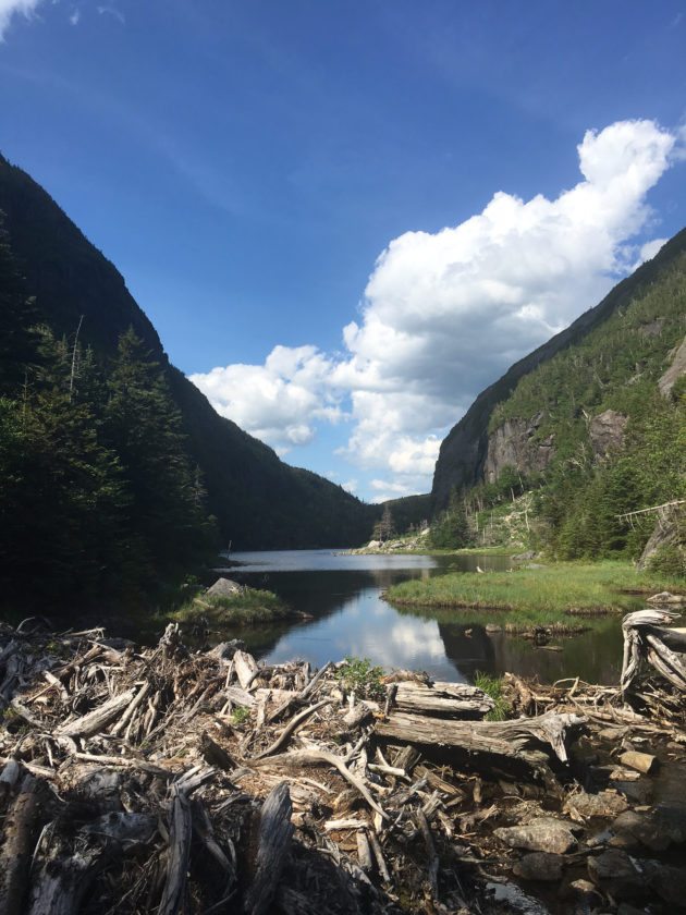 The “Hitch-Up-Matildas” consist of two sets of planks bolted into the cliff face along the northwestern shoreline of the lake. The pass is also a popular spot for rock climbers and those looking to scramble up to the 4,714-foot summit of Mount Colden through a steep, rocky slide in the middle of the mountain’s steep northwestern face known as the Trap Dike.