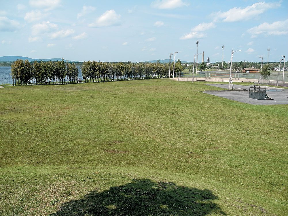 A proposed youth baseball field would have its home base between the skatepark, at right, and the row of trees along the shoreline, at left, in Tupper Lake’s Municipal Park, as seen Monday. (Enterprise photo — Aaron Cerbone)