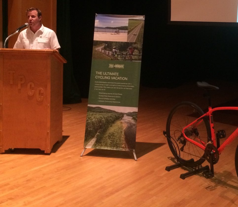 Cycle Adirondacks Co-Director Doug Haney provides an overview of next year’s tour Tuesday in North Creek. (Photo provided — Bill Quinlivan)