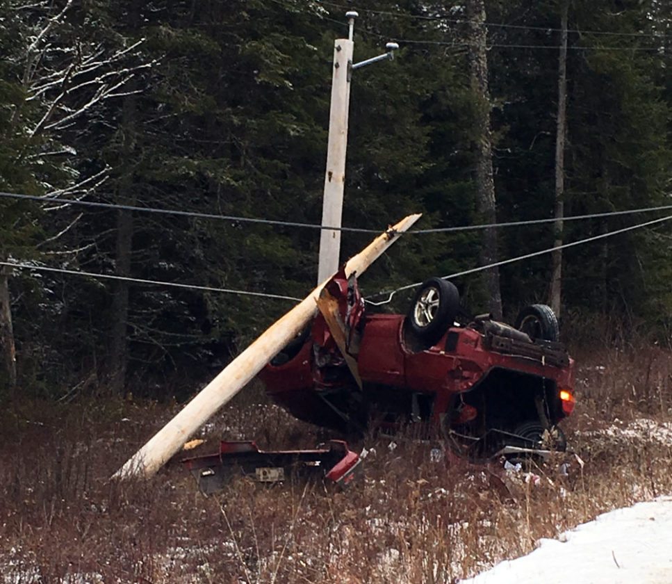 A fatal car crash snapped a utility pole Thanksgiving afternoon on Franklin County Route 55 between Bloomingdale and Gabriels. (Photo provided — Ryan Murray)