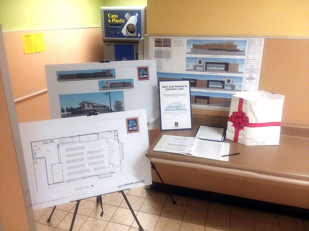 - A petition accompanies a display of architectural plans for a new Aldi building in Saranac Lake in mid January. Shoppers were asked to show their support for Aldi by signing. (Enterprise photo — Glynis Hart)