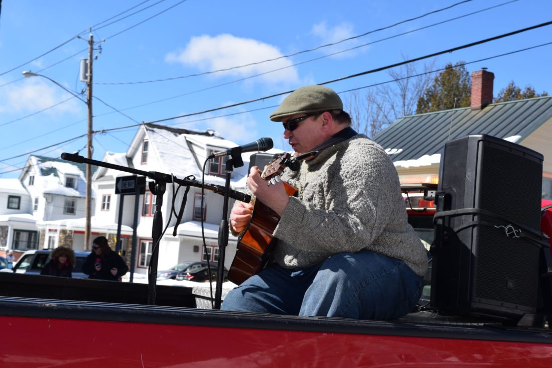 Beginning at St. Bernard’s School, the parade launched at 1 p.m. and wound down Church Street to Main, ending up at the Harrietstown Town Hall. The short parade route saved many from frozen fingers, including guitarist Kevin Wooley playing as he rode in a pickup truck.