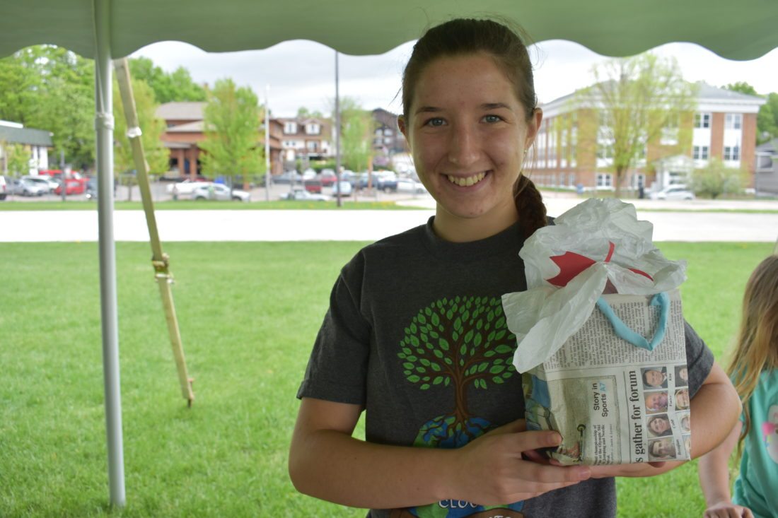 Lake Placid High School sophomore and environmental club member Anya Morgan poses with a gift bag made Enterprise newspapers. (Enterprise photo — Griffin Kelly)