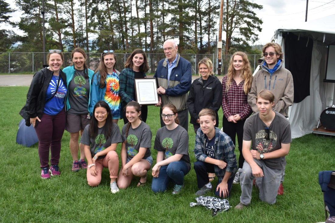 Lake Placid village Mayor Craig Randall poses with the Lake Placid Environmental Club at the Big Green Shin Dig on the Olympic Speedskating Oval Sunday. (Enterprise photo — Griffin Kelly)