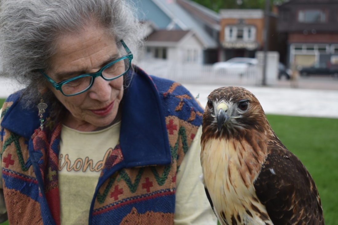 Wendy Hall of the Adirondack Wildlife Refuge and Rehab Center lets Jonas, a red-tailed hawk, perch on her arm. (Enterprise photo — Griffin Kelly)