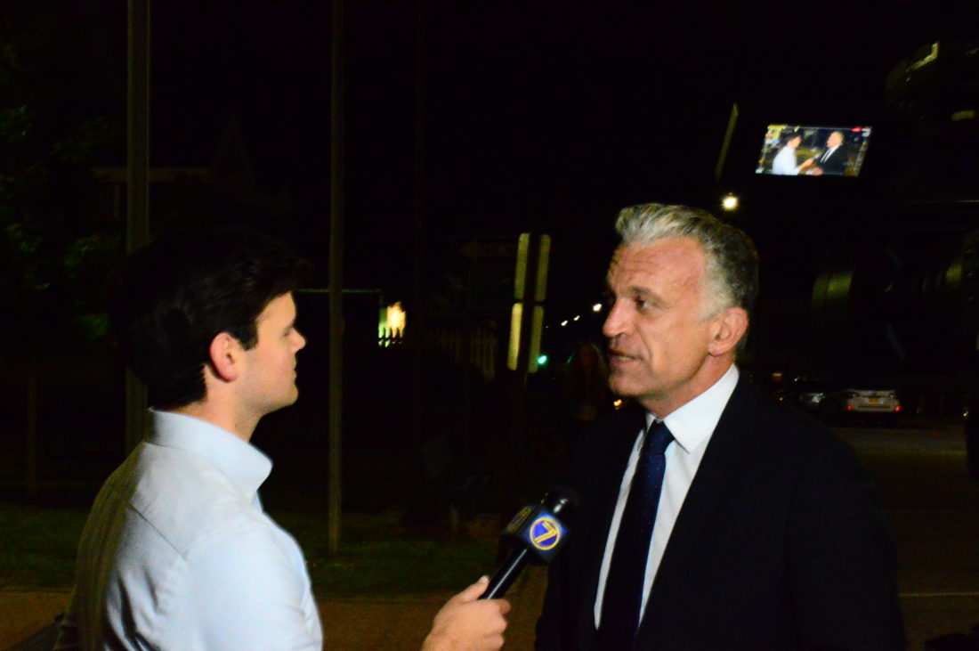 Congress candidate Dylan Ratigan talks to a television reporter outside the North Elba Town Hall in Lake Placid after Tuesday night’s Democratic primary. (Enterprise photo — Aaron Cerbone)