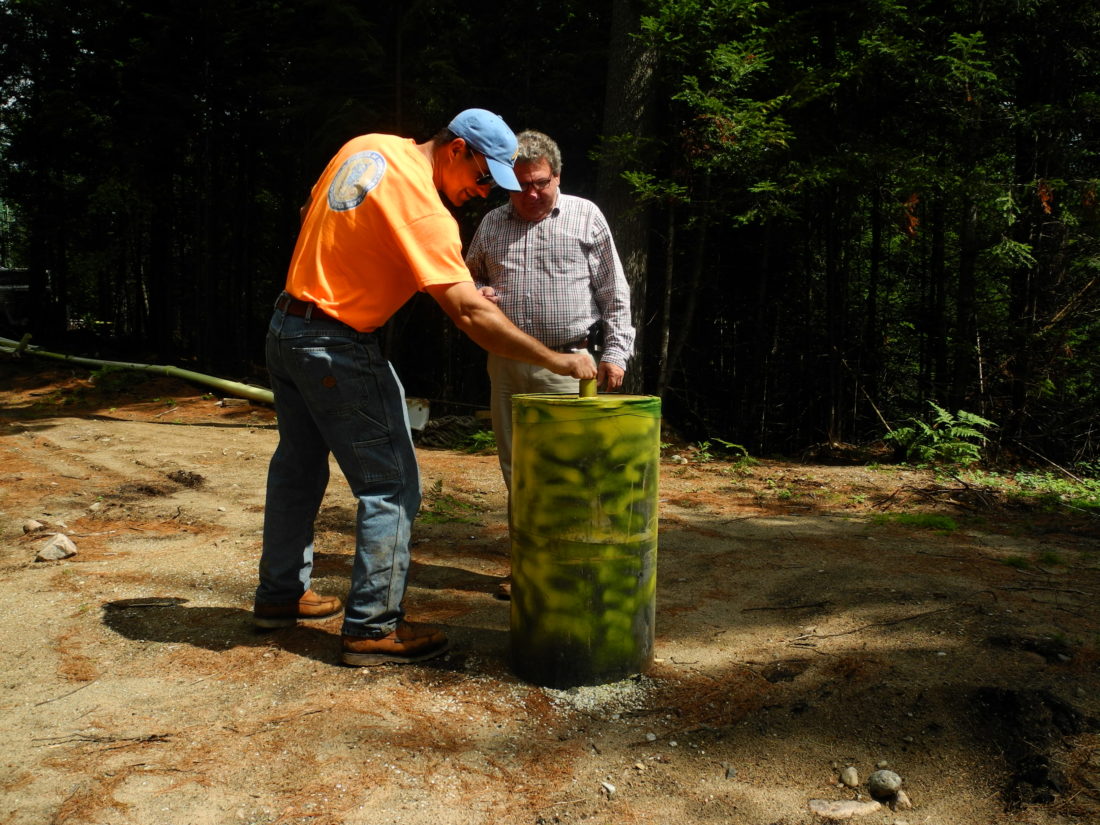 Village water department Supervisor Mark Robillard, left, and village mayor Paul Maroun take a look at one of Tupper Lake’s new wells in August, 2017. When the wells come online later this week, residents can expect cloudy water and sediment for the first couple days. (Enterprise photo — Aaron Cerbone)