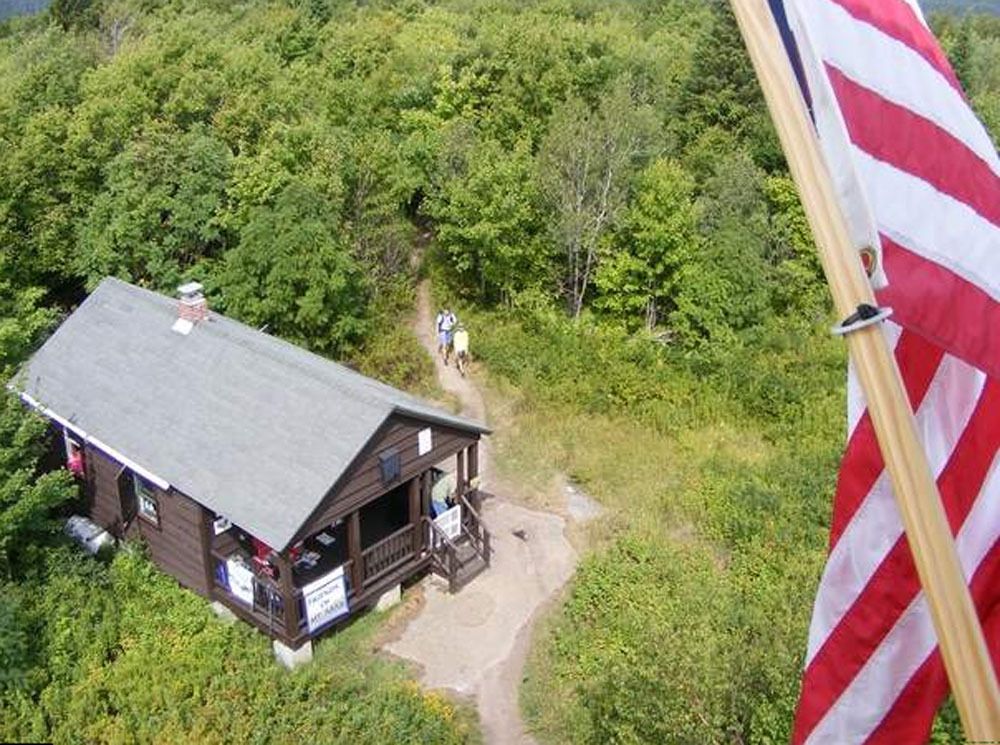 Two hikers approach the mountaintop cabin and Steward Thomas P. Cullen on Saturday morning on Mount Arab. (Photo — Tom Graser, Watertown Daily Times)