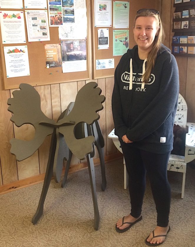 - Alyssa Hogancamp of Ulster County poses with the “Bruce the Moose” that she won in the Count the Moose Scat Contest. (Photo for the Enterprise — Bill Quinlivan)