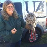 Mary Hall, Utica Zoo’s director of education, poses with wildlife from the Utica Zoomobile at The Great Adirondack Moose Festival. (Photo for the Enterprise — Bill Quinlivan)