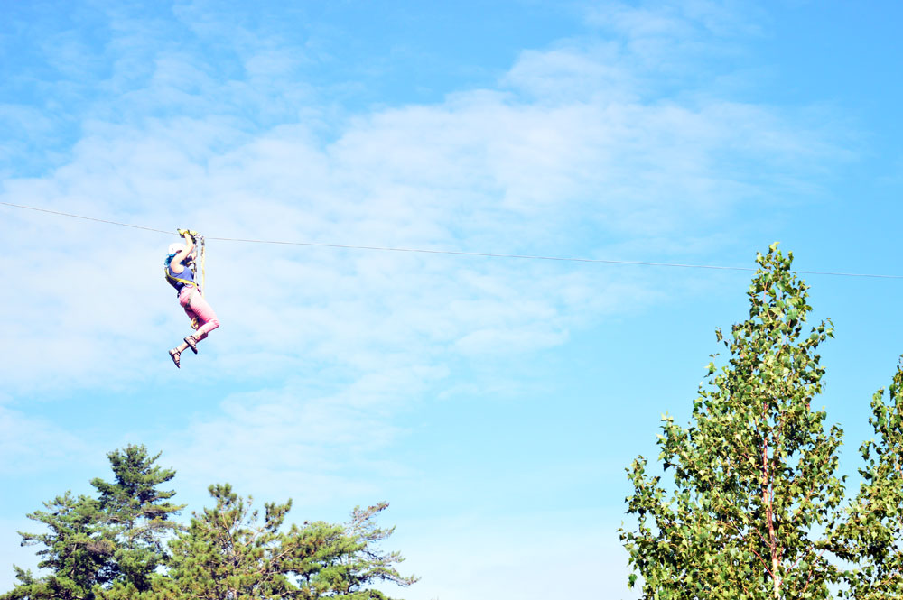 Senior Erin Roger ziplines 50 feet above Paul Smith’s College on her last first day of classes. (Enterprise photo — Aaron Cerbone)