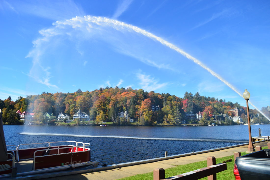 The Saranac Lake Volunteer Fire Department tests the pressure of its truck pumps annually by launching water over Lake Flower from the boat launch. In this photo the water is pressurized at 250 pounds per square inch, and launching 875 gallons per minute. Members said this is an annual test for insurance purposes. The village department is currently rates as a level 4 out of 10 right now, and members want to lower that to a 3 for a cheaper rate. (Enterprise photo — Aaron Cerbone)