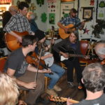 Nigel Darrah gently beat a bodhran, Alex Marklund picked his guitar, making that unique face that on the surface looks like rage but is actually enjoyment. Jenny Curtis tapped and scratched a wire drumstick along the Sunny Land scratch board. Instead of sitting, cellist Dave Filsinger tied the large string instrument to his front with a special wool strap he bought in Boone, North Carolina. His bow sat in a large pocket attache to his waist like .44 Magnum in its holster. The man of the hour influenced Filsinger to play by ear. Russ Mulvey of the swing jazz group Crackin’ Foxy plucked at the deep strings of his stand-up bass. Taped to the side of the bass was a set list from a previous gig: “Egyptian Ella,” “Drinking Red,” “Nagasaki.” Ben Hamelin, a regular, hadn’t yet picked up his acoustic guitar. He wanted to give other people a chance to play first.