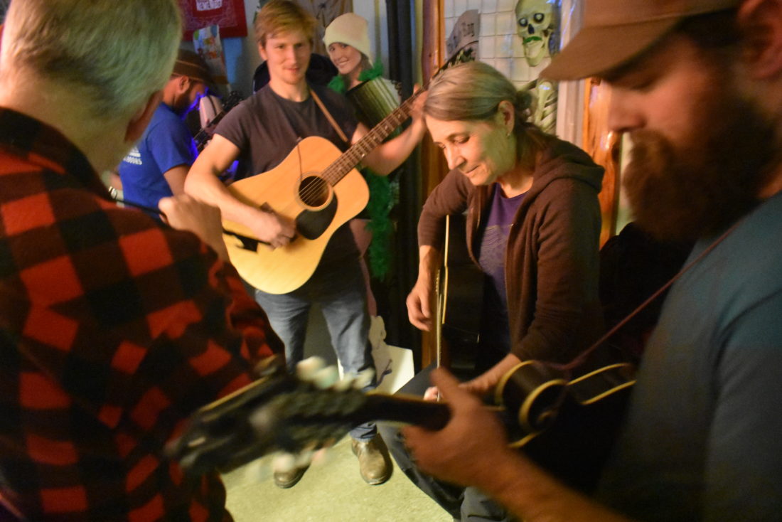 From left, Addison Bickford, Alex Marklund, Marion Hoelzel and Brady Callan jam in a corner of the Shamrock tavern in Gabriels Wednesday night in memory of their friend Jeff Couture, who was found dead at his home Monday. (Enterprise photo — Griffin Kelly)