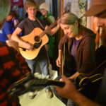 - From left, Addison Bickford, Alex Marklund, Marion Hoelzel and Brady Callan jam in a corner of the Shamrock tavern in Gabriels Wednesday night in memory of their friend Jeff Couture, who was found dead at his home Monday. (Enterprise photo — Griffin Kelly)