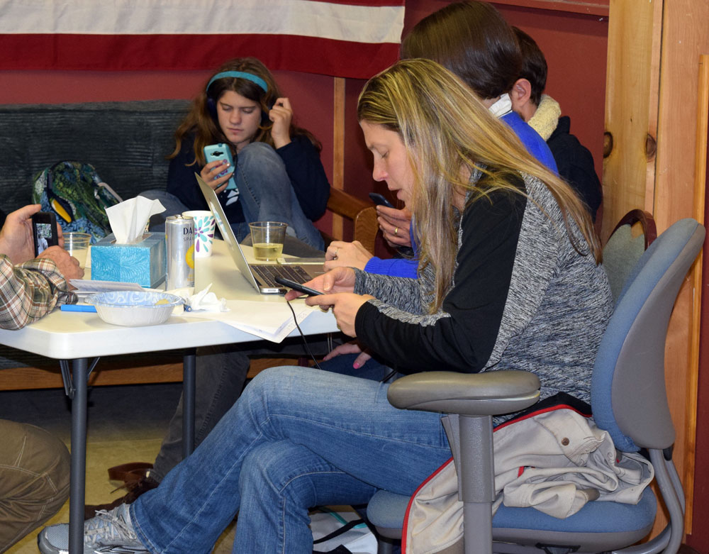 Jordanna Mallach tallies votes alongside her daughter and other supporters Tuesday night in the Voters for Change office in downtown Saranac Lake. (Enterprise photo — Jesse Adcock)
