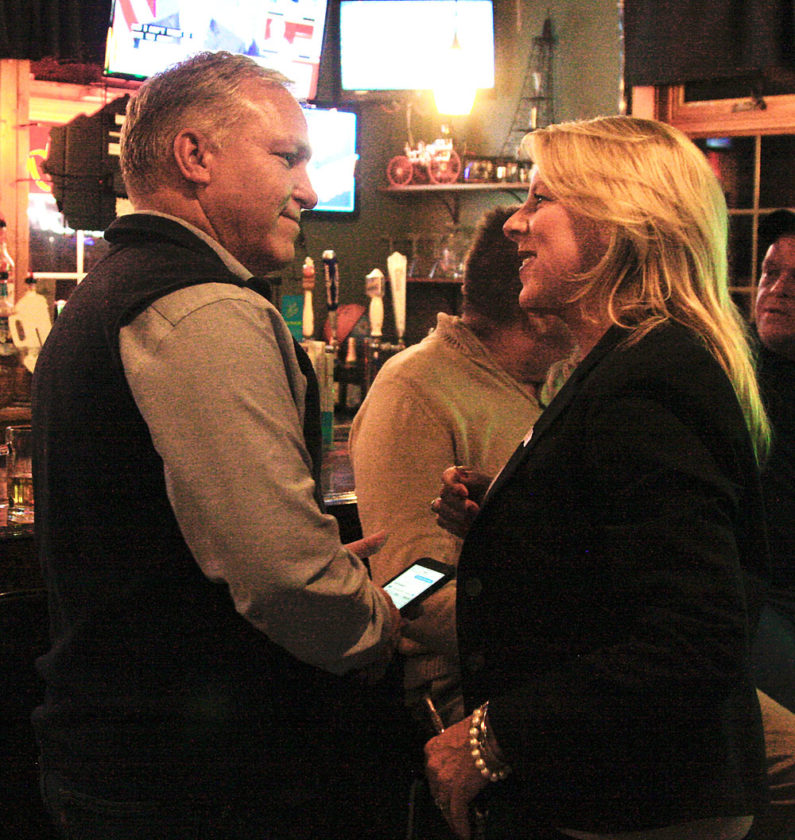 - Incumbent Franklin County Sheriff Kevin Mulverhill talks with county Legislator Andrea Dumas of Malone as they wait for the final election results to come in at a Republican Party gathering in Malone on Tuesday night. (Photo by the Malone Telegram)