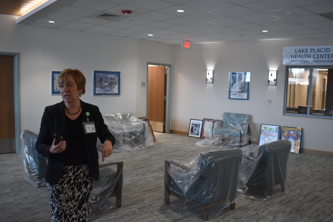 - Adirondack Health CEO Sylvia Getman stands in the second-floor lobby of the new Lake Placid Health and Fitness Center Monday during a tour of the facility. The medical center will have a rolling start and is expected to starting treating physical therapy patients Wednesday. (Enterprise photo — Griffin Kelly)