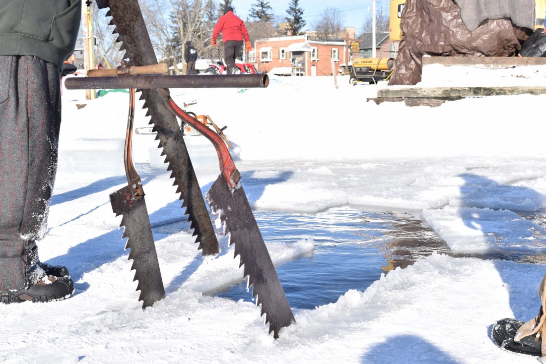 Garrett Foster worked on cutting the grid for the blocks, using an old, specialized saw to cut 7-and-a-half inches into the ice, which is a little less than a foot deep itself. He’s volunteered for this job with the IPW for the last 14 years.