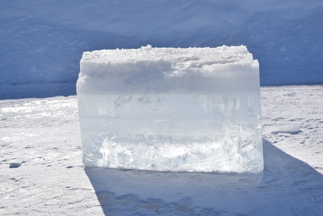 One of the first ice blocks to be sawed from the frozen surface of Lake Flower, to be used in the construction of the Ice Palace, seen on Thursday. (Enterprise photo — Jesse Adcock)