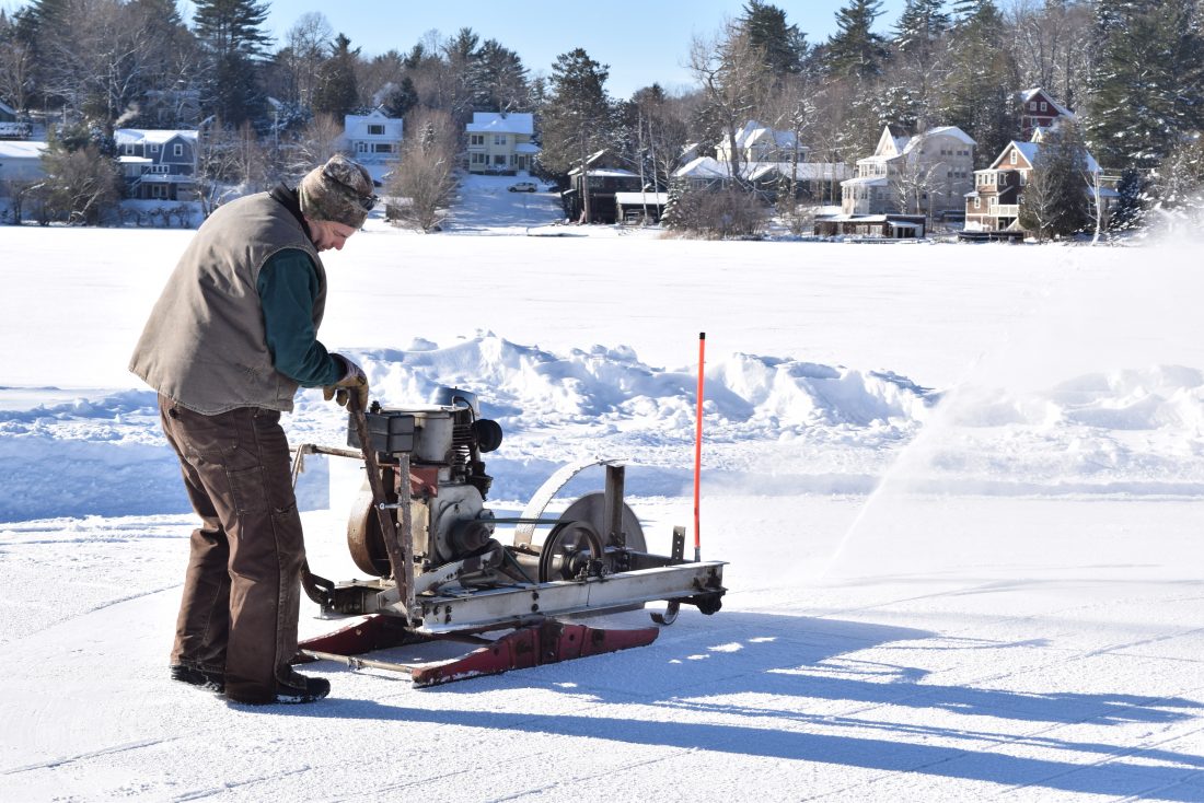 “We’re cutting ice for the first day,” said Dean Baker, who runs the operation. “Yesterday they put down screws to mark the corners.”