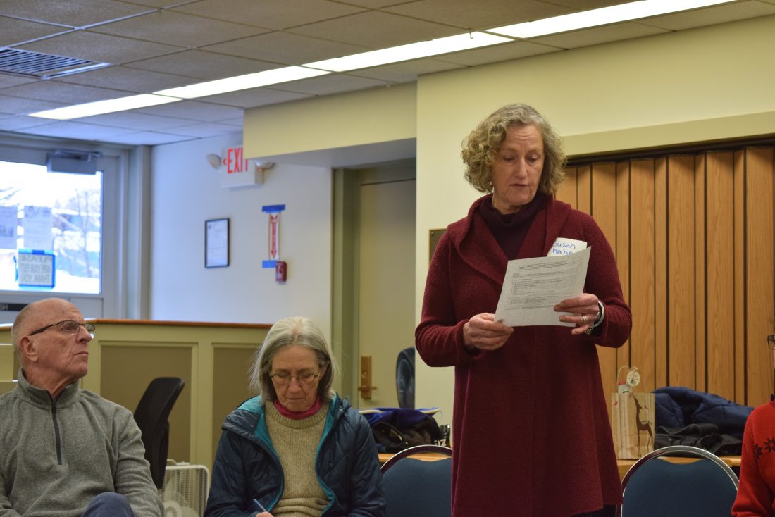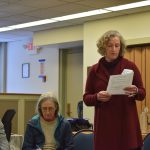 - Susan Hahn, who created the petition to the keep the pool at North Country Community College, reads an email from NCCC President Steve Tyrell in the Cantwell Room of the Saranac Lake Free Library Monday. (Enterprise photo — Jesse Adcock)