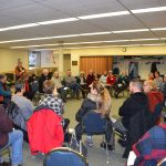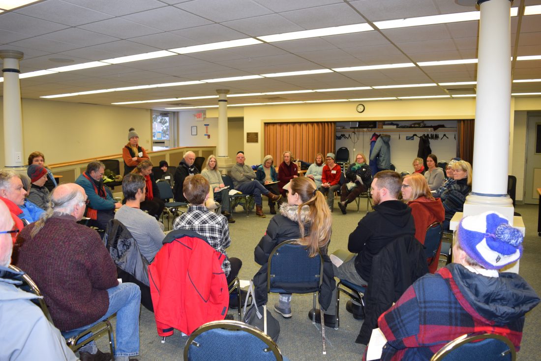 People from the surrounding area that care about keeping North Country Community College’s pool meet in the Cantwell Room of the Saranac Lake Free Library to discuss the issue Monday. (Enterprise photo — Jesse Adcock)