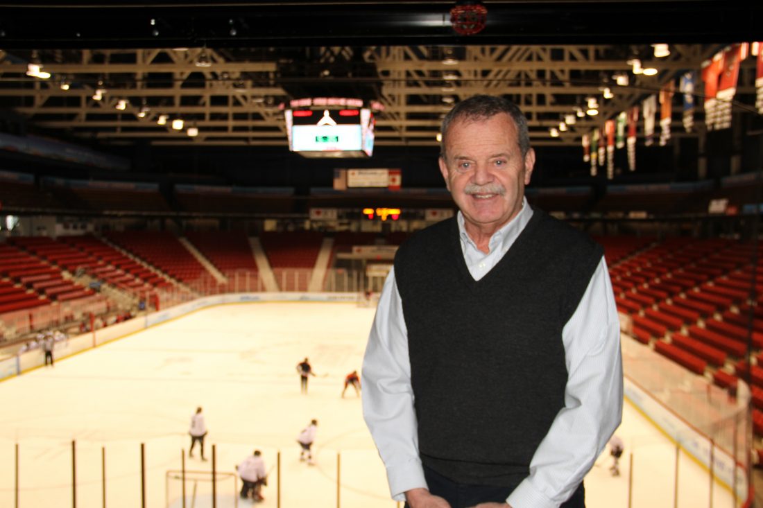 Former Olympic Center General Manager Denny Allen poses on April 20, 2018 at the 1980 Herb Brooks Arena a week before he retired from the state Olympic Regional Development Authority. (Enterprise photo — Andy Flynn)