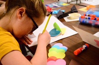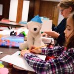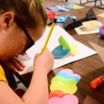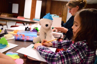 Claire Snye of Tupper Lake draws bears and stegosauruses on an origami pop-up card at the Goff-Nelson Memorial Library Thursday. (Enterprise photo — Aaron Cerbone)