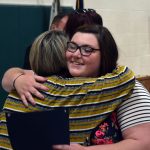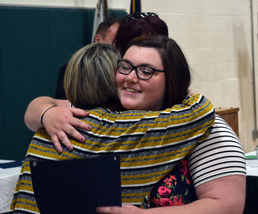 - Maddison Proulx of Tupper Lake hugs one of her cosmetology instructors, Katrina Brown, during the Adirondack Educational Center graduation Monday in the North Country Community College gym in Saranac Lake. (Enterprise photo — Kevin Shea)