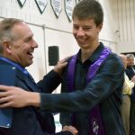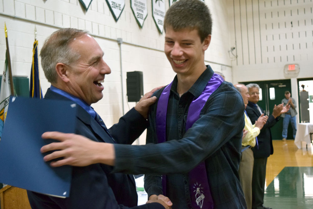 Building trades instructor Clarence Brockway, left, congratulates Grant Eckardt on graduating Monday at Adirondack Educational Center. Eckardt was the Saranac Lake recipient of the Apple Award, which goes to the student with the highest average in each school district. (Enterprise photo — Kevin Shea)
