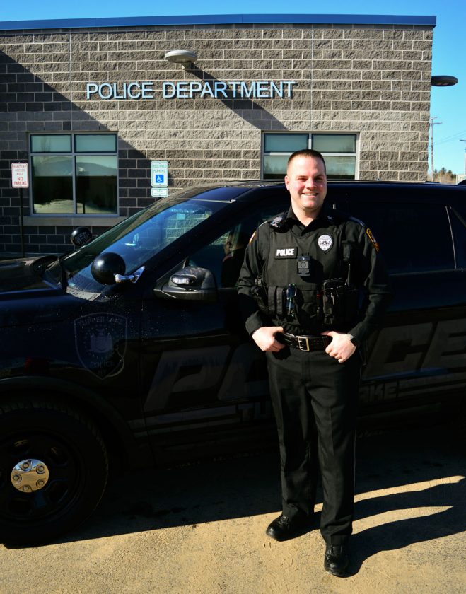 Keegan Muldowney smiles as a new Tupper Lake police officer in March. (Enterprise photo — Aaron Cerbone)