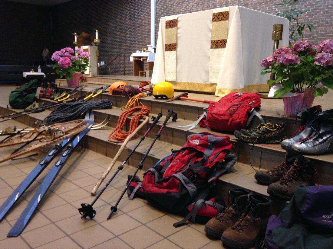 The gear of hikers, skiers and climbers was placed on the steps before the altar for Sunday morning Mass. A special blessing was done for hikers, skiers and climbers, and only this year, this weekend, does it make sense for the church to do so. A year ago, it would have seemed bizarre.